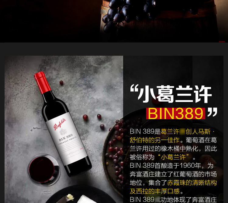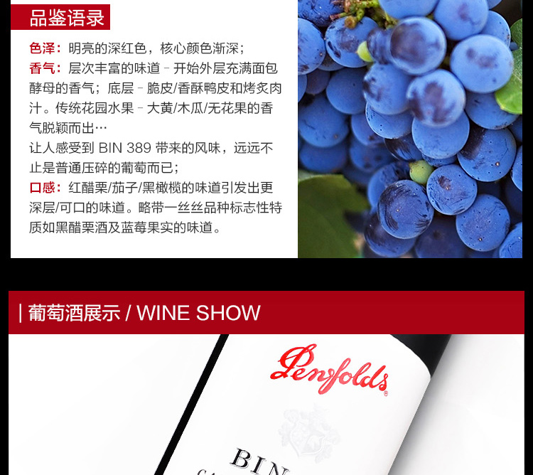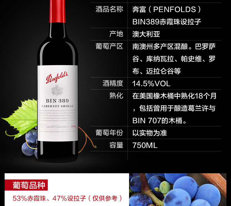 品名: :澳大利亞進(jìn)口奔富BIN389幹紅葡萄酒 原料與配表:葡萄、二氧化硫