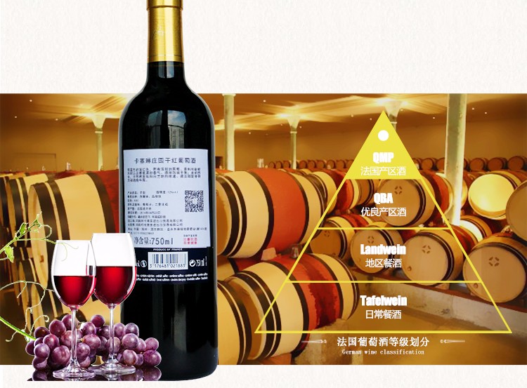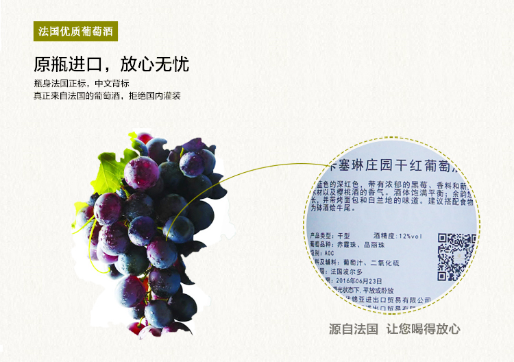 品名: :卡塞琳莊園AOC幹紅葡萄酒 法國(guó)原瓶進(jìn)口 原料與配表:葡萄、二氧化硫