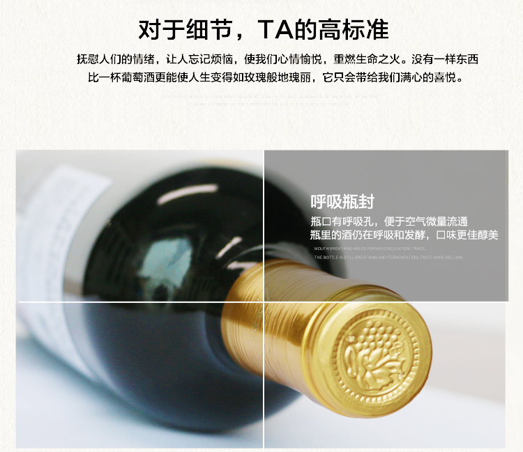 葡萄品種(zhǒng):赤霞珠、品麗珠 貯存條件:避免陽光直射、與5-25℃幹燥通風處卧放或 倒放為宜