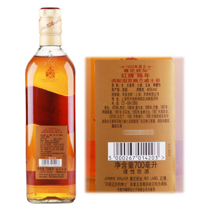 品名: :尊尼獲加紅牌調配型 蘇格蘭 威士忌 原料與配表:水、大麥、小麥、麥芽、焦糖色